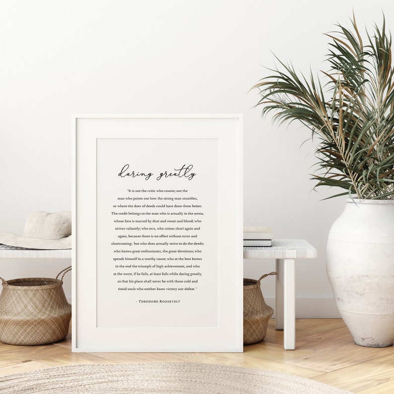 In the video brown starts by reciting a quote from president theodore roosevelt that she says changed her life and inspired the title of her book daring greatly. Decor for individuals · wear who you are · designs by top artists Große auswahl · bestseller · neuerscheinungen · versandkostenfrei Who at the best knows in the end the triumph of high achievement, and who at the worst, if he fails, at least fails while daring. How the courage to be vulnerable transforms the way we live, love, parent, and lead, brené harkened back to a speech that teddy roosevelt gave in 1910. " it is not the critic who counts, not the one who points out how the strong man stumbled or how the doer of deeds might have done them better. Brené brown and teddy roosevelt s top 21 tweet tweets they re the aha inducing thoughts about shame vulnerability and daring greatly we can t get enough of. As a society, this listen to the theodore roosevelt quote that inspired the book title, daring greatly. But who does actually strive to do the deeds; The phrase daring greatly is from theodore roosevelt's speech citizenship in a republic. "it is not the critic who counts; The woman in the arena,theodore roosevelt quote,feminism print,daring greatly,inspirational print,motivational saying,encouragement gift. More images for roosevelt quote daring greatly »